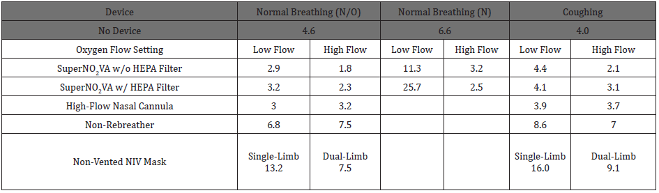 Methods: To simulate real-life clinical scenarios, a surrogate head with adult morphology within an airtight containment box reproduced Nasal-only (N) and Nasal/Oral (N/O) Normal Breathing as well as Coughing for six respiratory support devices: SuperNO2VA with and without HEPA filter; High-Flow Nasal Cannula (HFNC); Non-Rebreather; NV-NIV Mask, both single-and dual-limb; and no device.