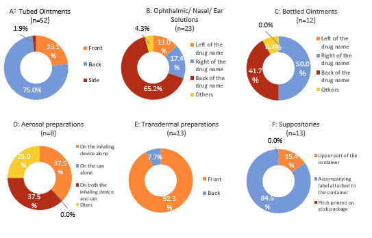 Concerning drugs for external use, the position of printing of GS1 DataBars was classified as follows by the dosage form: In tubed ointments, the position was classified into front, back, and side by defining the surface on which the drug name was indicated as front. For ophthalmic/nasal/ear solutions and bottled ointments, as the labels on which GS1 DataBars were printed were attached to the containers, the position was classified as left of the drug name, right of the drug name, or back of the drug name with the position of the drug name as the reference point. If the front of the container was unable to be determined for reasons, such as too large or too small labeling of the drug name, the front and back of the container were judged by defining the gap between labels or the window for checking the amount of the remaining drug as the side. For aerosol preparations, the position of GS1 DataBars was classified as “on the inhaling device alone”, “on the can alone”, and “on both the inhaling device and can”. For transdermal preparations, the surface on which the drug name was indicated was defined as the front, and the position was expressed as front or back. For suppositories, the position of GS1 DataBars was classified as the upper part of the container, accompanying label attached to the container, and pitch printed on stick package.