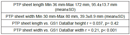 The height and width of GS1 DataBars were most frequently 3 mm and 19 mm, respectively, regardless of the size of the PTP sheet itself (Tables 1-3), (Figure 1).