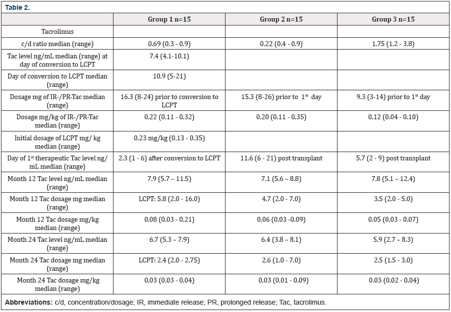 Immunosuppression consisted of a lymphocyte depleting agent, PR-Tac (in 15/14/14 patients in group 1/2/3, respectively) or immediate release (IR)-Tac (1 patient each in group 2 and 3 for logistic reasons), MMF, steroids (Table 1). The targeted Tac-level (ng/mL) was 12-14 during the first month and 4-6 after 1 year. The initial dose of oral PR-Tac was 0.07 mg/kg and gradually increased in order to achieve the targeted Tac trough level. In response to subtherapeutic Tac-levels despite incremental increase of PR-Tacdosage, 15 patients were converted to LCPT (median day 10.9; range 5-21). They were identified as Tac-fast metabolizers (group 1) by ac/d ratio<1.05 (median: 0.69; range 0.3–0.9). Another 15 fast metabolizers (median c/d ratio 0.22; range 0.4–0.9) received high dose of PR-Tac (group 2). Group 3 consisted of 15 Tac-non-fast metabolizing patients (median c/d ratio 1.75; range 1.2-3.8). Details are depicted in table 2. CYP 3A5 genotyping was not performed for logistic reasons.