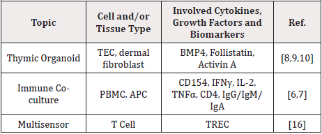 Current immune testing has evolved rapidly, ranging from in silico prediction of epitopes to proteomic-based binding assays [6]. In cell-based systems, most assays involved coculture in membrane-separated compartments, but some advocate for true 3D architecture organoids [6,7]. Fortunately, the field benefits from the existence of proof-of-concept microfluidic organoid models for lymph node and bone marrow [1,2]. Including thymus gland is important for recapitulating a physiologically realistic model system because of pharmacokinetic volume effects due to the relative sizes of each organ compartment in the chip system [1] and because of thymus effects on T Cell pool size to accurately recreate in vivo conditions. Thymus can be grown in explant culture using the hanging drop method [8], the first attempt at thymic organoid culture used tantalum-coated carbon matrix scaffolds [9]. Attention has focused on growth and differentiaton of Thymic Epithelial Cells (TEC) because of their role in selection of T Cells [10,11]. Existing protocols for 3D organotypic culture of TEC employ a variety of scaffolds including foamed tantalum and recellularized extracellular matrix [9,12]. With further development of a 3D immune organoid systems, it will be possible to continue efforts characterizing the mechanical interactions of: TECs and T Cell precursors; interactions within a TEC layer; interactions between T Cells and endothelial cells; and interactons between T Cells encountering antigen-presenting-cells (APCs) [13,14]. DNA-probes can enhance the sensitivity of the system by measuring pico newton forces in short-lived interactions as well as characterization of cellsubstrate interactions [15]. Placement of cell-laden scaffolds into specific loci during the layout design of polydimethylsiloxane PDMS microchannels facilitates connection to a Body-on-Chip system [2,3].